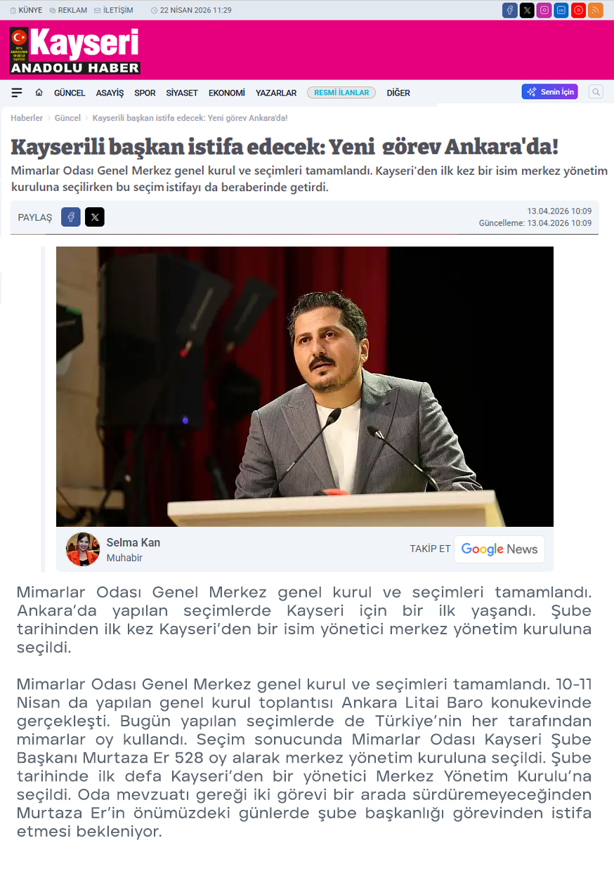Mimarlar Odası Genel Merkez genel kurul ve seçimleri tamamlandı. 10-11 Nisan da yapılan genel kurul toplantısı Ankara Litai Baro konukevinde gerçekleşti. Bugün yapılan seçimlerde de Türkiye’nin her tarafından mimarlar oy kullandı. Seçim sonucunda Mimarlar Odası Kayseri Şube Başkanı Murtaza Er 528 oy alarak merkez yönetim kuruluna seçildi. Şube tarihinde ilk defa Kayseri’den bir yönetici Merkez Yönetim Kurulu’na seçildi. Oda mevzuatı gereği iki görevi bir arada sürdüremeyeceğinden Murtaza Er’in önümüzdeki günlerde şube başkanlığı görevinden istifa etmesi bekleniyor.