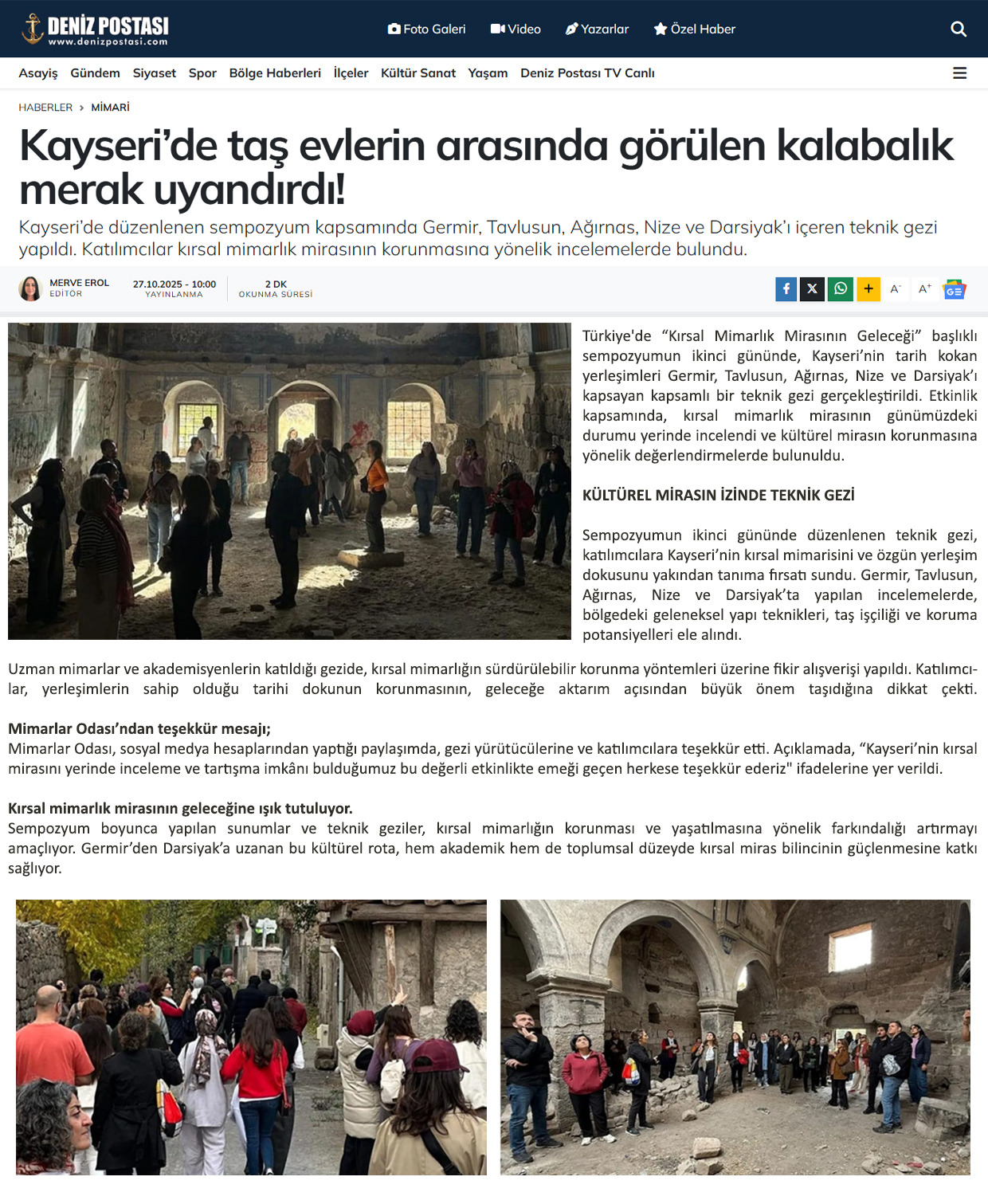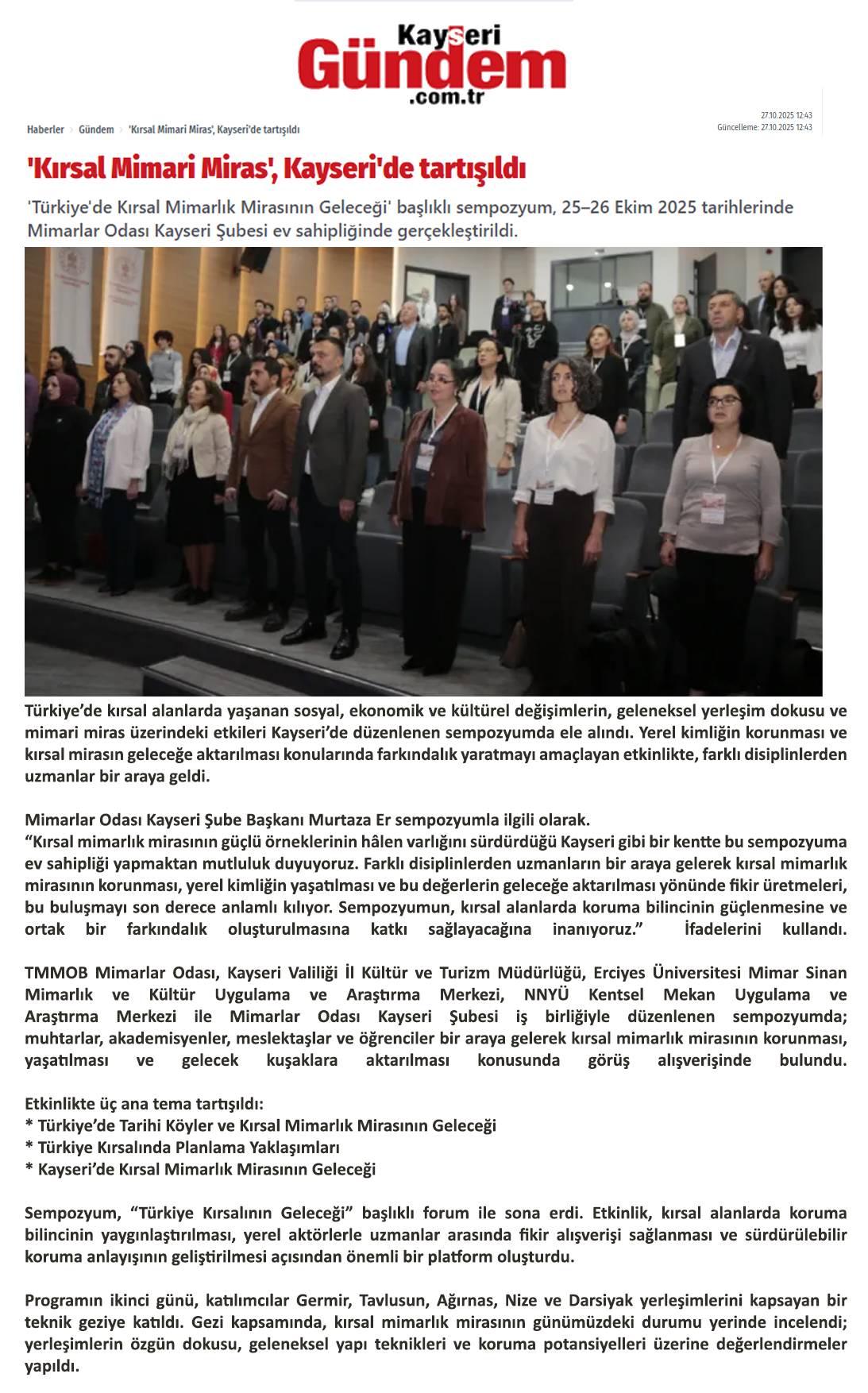 TMMOB Mimarlar Odası, Kayseri Valiliği İl Kültür ve Turizm Müdürlüğü, Erciyes Üniversitesi Mimar Sinan Mimarlık ve Kültür Uygulama ve Araştırma Merkezi, NNYÜ Kentsel Mekan Uygulama ve Araştırma Merkezi ile Mimarlar Odası Kayseri Şubesi iş birliğiyle düzenlenen sempozyumda; muhtarlar, akademisyenler, meslektaşlar ve öğrenciler bir araya gelerek kırsal mimarlık mirasının korunması, yaşatılması ve gelecek kuşaklara aktarılması konusunda görüş alışverişinde bulundu.